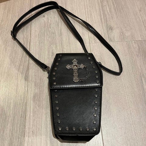 Bannedin Goth lompakko, 8 korttitaskua ja 2 leveämpää taskua sivuilla. Keskellä vetoketjullinen tasku esimerkiksi kolikoille. Koko noin 19,5cm x 10cm x 2cm. Hyvä käytetty kunto.