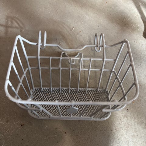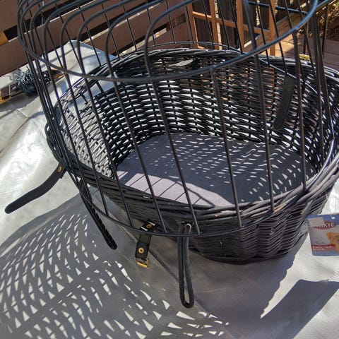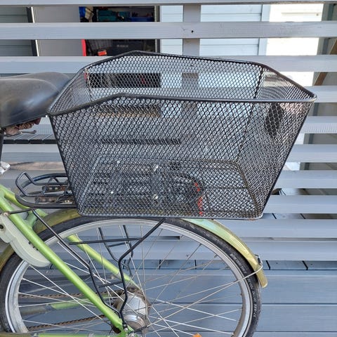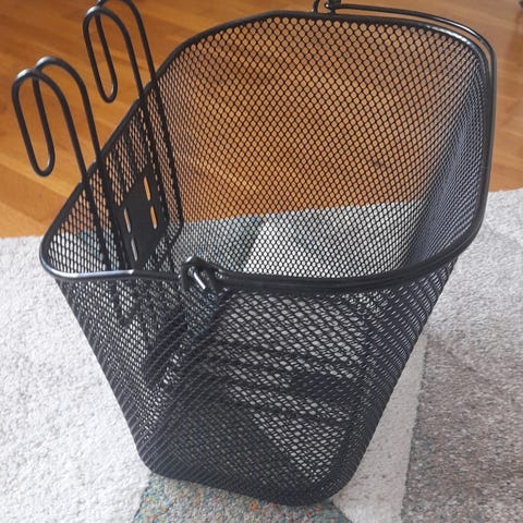 Syvä kori jonka saa kiinni polkupyörän tankoon,kantokahvalla. Nouto