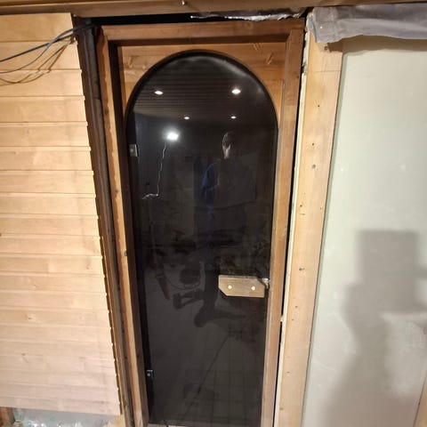 Myydään hyvä kuntoinen saunan lasiovi, väri rusehtava, koko 7x19, uudet leppäkarmit.