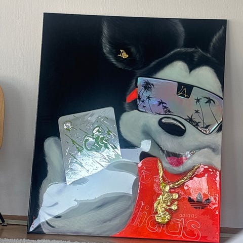 Unohda posliininen figuuri, joka on kiinnitetty tiskille: tässä XXI:n vuosisadan Maneki-Neko, joka on kasvanut hip-hopin ja skeittiparkkien asvaltin tahdissa. Tämä ainutlaatuinen teos on sabluunalla maalattu aidon kierrätetyn skateboardin päälle ja tuo uutta energiaa japanilaisen onnen perinteiselle ikonille.Taiteilijan kynän alla talisman-kissa muuntuu karismaattiseksi 'Street'-hahmoksi. Koristeltu neonvärisellä kanjipainatuksella varustetun pipon ja löysän hupparin kanssa, se nostaa tassua ylpeästi — ei tervehtiäkseen, vaan ilmaistakseen läsnäolonsa kaupungin tilassa. Väriharmonia on täynnä elinvoimaa: taustalla sähköinen turkoosi kontrastoi magentan roosan ja keltaisen sävyjä, ja koko on täynnä monivärisiä tähtiä, jotka näyttävät tihkuvan laudalta kuin onnen sade.Jokainen yksityiskohta, tyyliteltyjen kenkien ja tähtigraffitien kautta, kertoo tarinan kulttuurien fuusioitumisesta. Valitsemalla antaa skeittilaudalle toisen elämän, taiteilija muuntaa kuluneen esineen moderniksi totemiksi. "Lucky Street Cat" ei ole pelkästään koriste-esine; se on optimismin ja graafisen kapinan tiivistys, joka vangitsee katseen eikä päästä sitä irti. Se on täydellinen teos niille, jotka haluavat tuoda onnea kotiin, mutta asenteeltaan vahvasti funky ja kapinallinen.Miksi hankkia tämä teos?Kulttuurinen kontrasti: Uhmakas liitto skeittikulttuurin ja perinteisen Maneki Neko -esityksen välillä.Yksilöllinen teos: Käsin tehty, jokainen puun pinnassa oleva jälki tekee tästä teoksesta identtisen kopioimisen mahdottoman.Tekniset ominaisuudet:Asennus: voidaan ripustaa seinälle (kiinnitys ei sisälly) tai yksinkertaisesti asettaa, luoden teollisen loft-tyyppisen ilmeen.Aitous: taiteilijan allekirjoitus takana ja logo laudan alapäässä.Anna sisään kadun sielua ja identiteetin pohdintaa osaksi kotiasi.