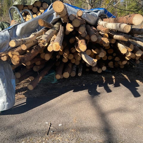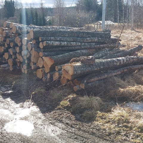 Kuusi ja mäntyrankaa helposti tien varressa. Näppärä nostella kärryyn. 40e kuutio. Vain nouto.