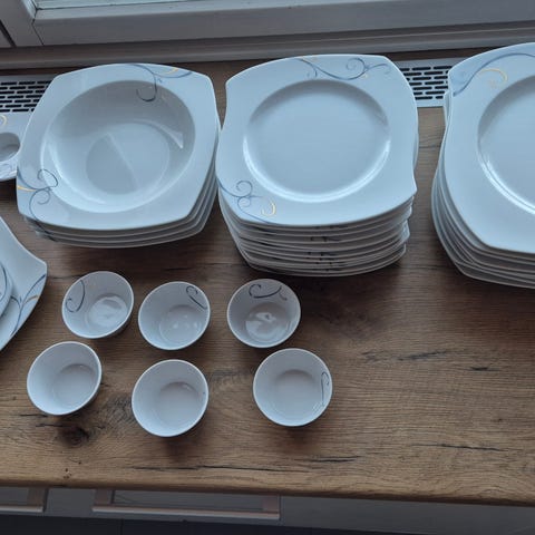 Käyttämätön astiasto.