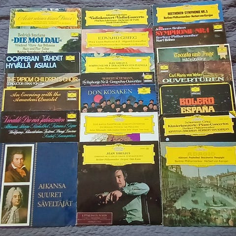 3. Herbert von Karajan/Berliner Philharmoniker: Jean Sibelius, Finlandia, Valse Triste, Tapiola, Tuonelan Joutsen (Deutsche Grammophon 1984, Saksa). Kunto: erittäin hyvä (yksi pieni naarmu), kansi kuin uusi. Hinta 4 e.