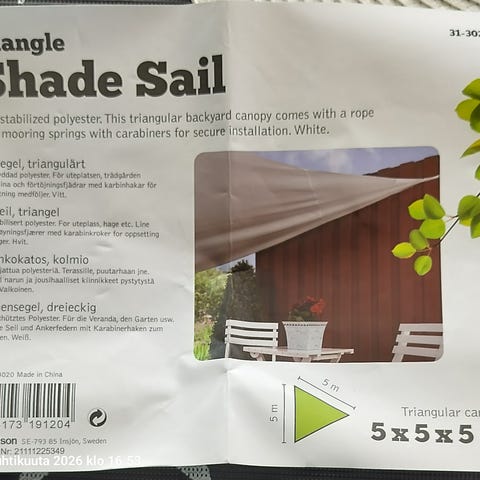 Lapun mukainen iso purje terassille varjostamaan! Kuin uusi! Hetken käytössä...oli meille liian iso😔