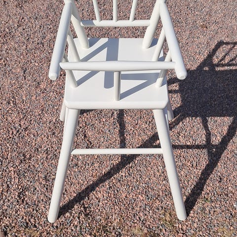 Kotimainen, puinen syöttötuoli. Ehjä, mutta käytön jälkiä löytyy.