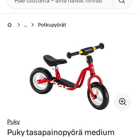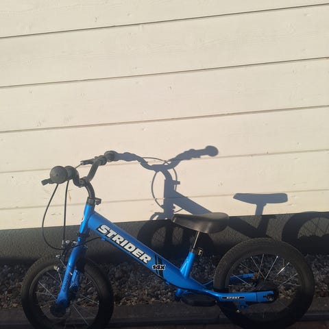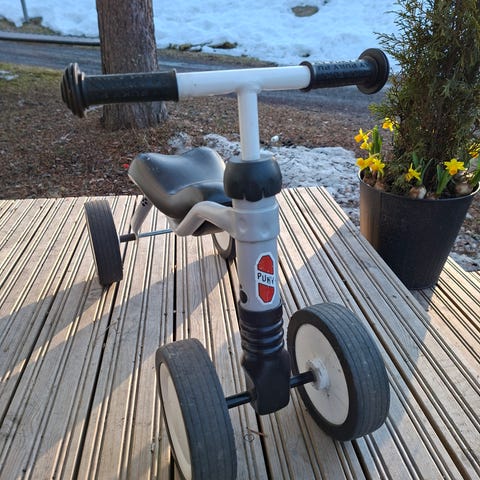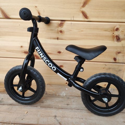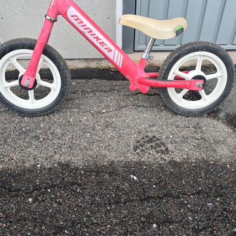 Lasten potkupyörä, jossa 12" renkaat. Pyörässä on toimiva käsijarru ja soittokello. Pyörä on hyvässä kunnossa ja suoraan käytöstä seuraavalle lapselle tasapainon harjoitteluun.