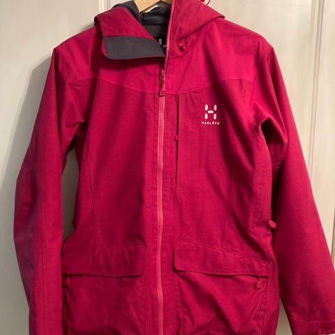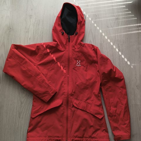 Haglöfs Husk Jacket Women -takki. Koko S. Väri punainen. Materiaali pääosin polyamidia. Takissa on vetoketjukiinnitys edessä ja kiinteä huppu. Edessä vetoketjulliset taskut. Kevyt kuoritakki, joka soveltuu esimerkiksi ulkoiluun ja arkeen viileämmillä keleillä. Sisäpuolella verkkomainen vuori parantamassa käyttömukavuutta. Pientä tummaa jälkeä hihoissa mikä ei ole lähtenyt pesussa. Muuten ehjä ja siisti. Kiristys helmassa ja hihoissa.