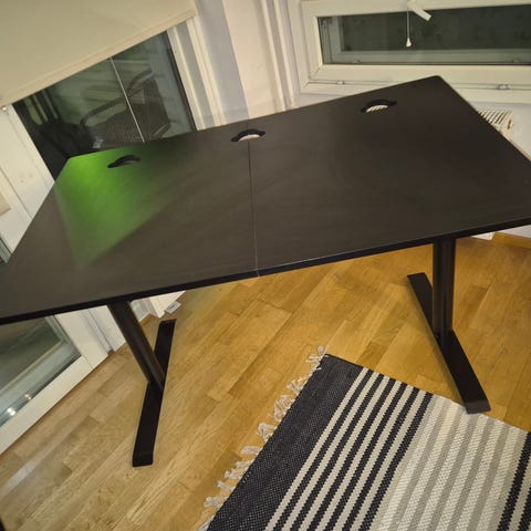 Pelipöytä jossa kestävä hiilikuitutekstuuri sekä mukiteline ja kuuloke teline löytyvät. Suunnittelija ja merkkiä en tiedä. Vuosi sitten ostin tämän 24hshop.fi sivulta. Alkuperäiset LED RGB valot hävinneet muuton yhteydessä (ehkä joutuneet roskiin) sen takia pöydän pohjassa RGB valojen johtopidikkeet. Toivoisin pikaista yhteyden ottoa. Mobilepay tai käteinen käyvät ja nouto jos mahdollista. Nopeimmalle hakijalle 80€.