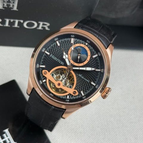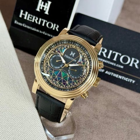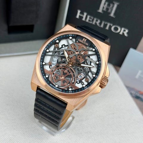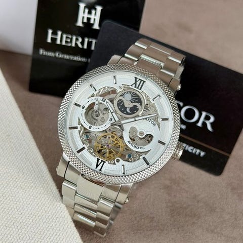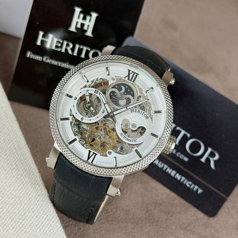 Kaunis herrakello Heritorin Aries-sarjasta. Viitenumero HERHR4403, kulta/hopea -värisenä. Kellon koneistoa kasvattaa automaattinen koneisto, joka näkyy kellon takapinnalla. Kellon koneisto on myös näkyvissä edessä erottuvan skeletoituneen kellotaulun ansiosta. Hyvin luettavissa viisareiden ja indeksien kontrastin vuoksi. Varustettu erottuvan muotoisella kotelolla.Uusi ja käyttämätön!Kello on mukana tulevalla teräksisellä rannekkeella. Toimitetaan sis. kaikki esillä olevat tarvikkeet ja tyhjät dokumentit. Koneisto: AutomaatinenKotelon materiaali: teräs (päällystetty kultauksella)Läpäisymitta: n. 47 mm ilman kruunua.Rannekkeen pituus: n. 20 cm. Kellon kanssa.Ikä: 2020+Lähetys on vakuutettu.Kuvat ovat osa kuvausta.