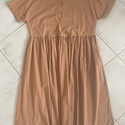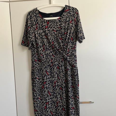 Rils arkimekko, koko L. Materiaalina pellava. Mekossa on monivärinen, graafinen kuosikuvio, jossa on mustan, ruskean, harmaan ja valkoisen sävyjä. Malli on väljä ja polvipituinen tai hieman sen alapuolelle ulottuva. Pääntiessä on halkio ja hihat ovat puolipitkät, joissa on napillinen käänne. Sopii arkipukeutumiseen ja rennon siistiin käyttöön.