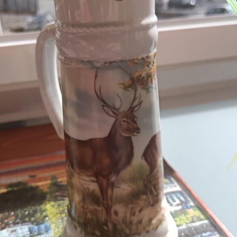 Olutkolpakko lasia. Läpinäkyvä lasinen kolpakko, jossa sivussa painettu keltainen ja violetti teksti- ja kuviointi. Sopii esimerkiksi oluen tai muiden juomien tarjoiluun. Varustettu tukevalla korvalla helpompaa otetta varten.