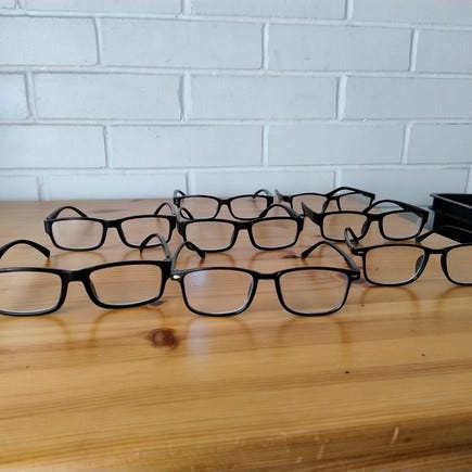 Käyttämättömät lukulasit myydään yhdessä tai erikseen. 5,-/pari.