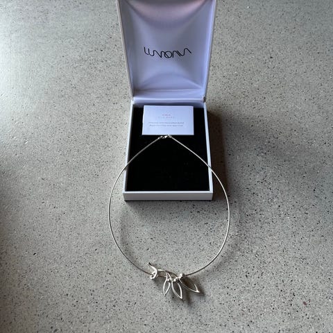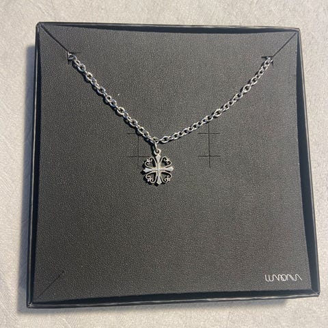 Lumoava hopeinen kaulakoru. Ketjun pituus 45 cm. Riipuksen läpimitta 2,8 cm. Leima 925