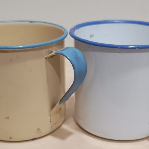 Iso valkoinen kannu missä reunat ja kahva on sininen. Pohjassa pieni reikä. Toinen puoli on erittäin siisti ja toisessa puolessa kannu on ajan patina. Tämä ei ole käyttökelpoinen kun puhutaan juomasta ja ruuasta mutta erinomainen sisustukseen. Esim todella kaunis vaasi.