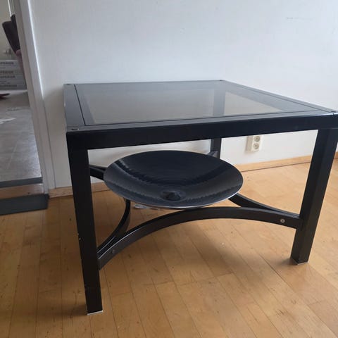Tummalla lasisella tasolla varustettu sohva- tai sivupöytä. Kunto hyvä.