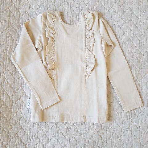 Ihana Gugguun Bella-paita vaaleanvihreässä värissä. Koko 104 cm. Paidassa edessä frillakoristeet, jotka jatkuvat kaula-aukon taakse. Paita ehti vain paristi käyttöön. Kunto erittäin hyvä, ehjä ja siisti.