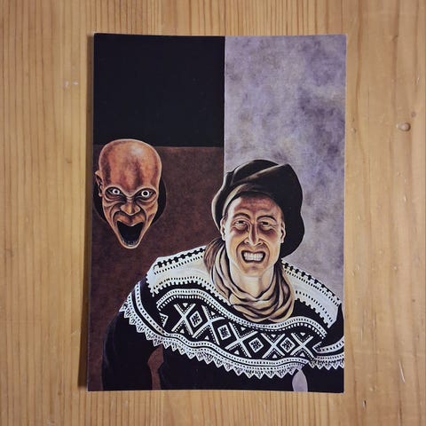 Postikortti, jossa on kuvattuna kääpiömäinen hahmo valkoisessa puvussa ja punaisessa, terävässä hatussa. Tausta on jaettu vaaleaan seinään ja punertavaan lattiaan.