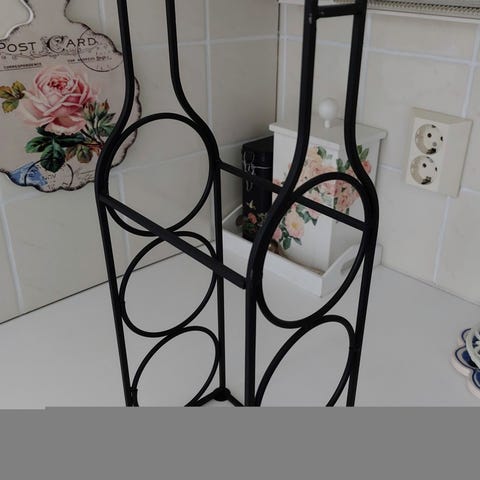Musta noin 2 v vanha metallinen viinipullohyllykkö. Vain nouto. Mitat korkeus 70 cm. Leveys 45 cm. Syvyys 35 cm.