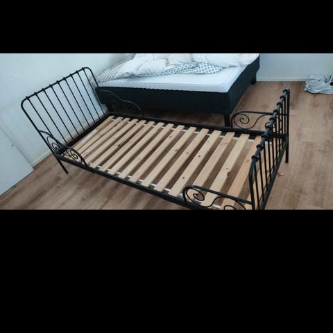 IKEA Minnen sänky. Musta metalli runko, jonka saa kolmeen eri pituuteen: 130 cm, 165 cm ja 200 cm.