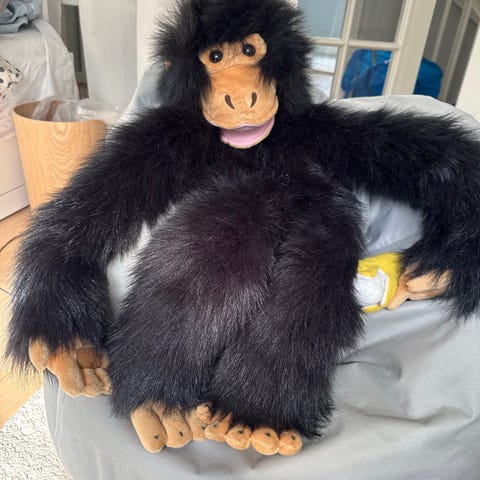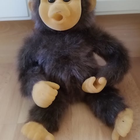 Vanhempi gorilla lelu,äänitoimintoja en saanut toimimaan, vaikka vaihdoin paristot. Gorilla on erittäin hyväkuntoinen, ja kiva leikkeihin ihan näinkin, tai vaikkapa koristeeksi. Istumakorkeus n.32 cm.
