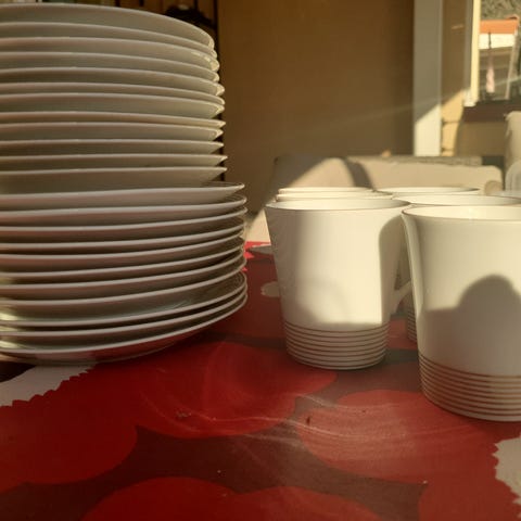 6 kahvikuppia asetilla (13,5cm) 5 pullalautasta (17cm). 2:ssa asetissa pienet säröt (kuvassa)