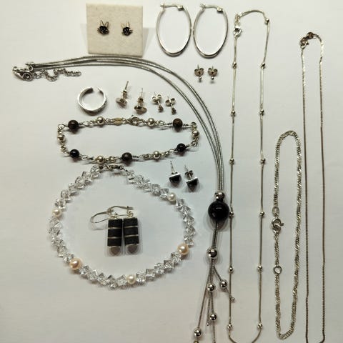 Myydään setti hopeakoruja, leimat löytyy kaikista paitsi paksuista rengaskorviksista (pitäisi kuitenkin olla hopeaa) ja harmaasta helmiriipuksesta. Kaulakoruja, rannekoruja, korviksia. Osassa kivihelmiä. Korujen puhdistuksen jätän ostajalle. Myyn vain settinä. Hinta 34 euroa postikuluineen kirjeessä. Voi myös noutaa.