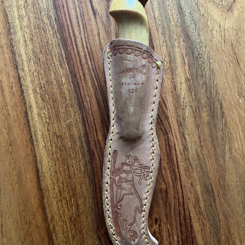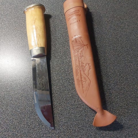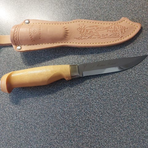 Marttiini vanha kätevä puukko nahkatupessa jossa vanha Pohjola logo. Siisti, pienellä nimi tupessa ja pientä käytön jälkeä puukossa. Pk 7.90€