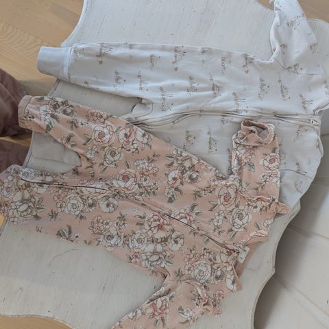 Kaksi vetoketjullista yöpukua. Muumi 86 cm ja Lindex 92 cm.
