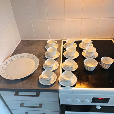 Arabian riisiposliiniset mokkakupit ja -tassit alkuperäispakkauksessaan. 1970-luvun tuotantoa, massasigneeraus F HK, suunnittelija Friedl Holz-Kjellberg. Käyttämättömät.
