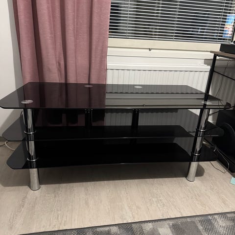 Lasinen tv-taso kolmella hyllyllä. Vain nouto.