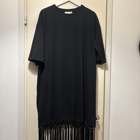 Mekossa on pyöreä pääntie ja vartaloa myötäilevä yläosa sekä levenevä helma. Musta pitsikuvoinen. Hyvässä kunnossa.