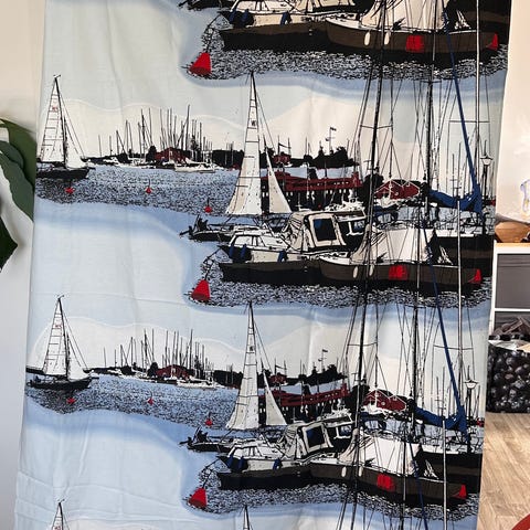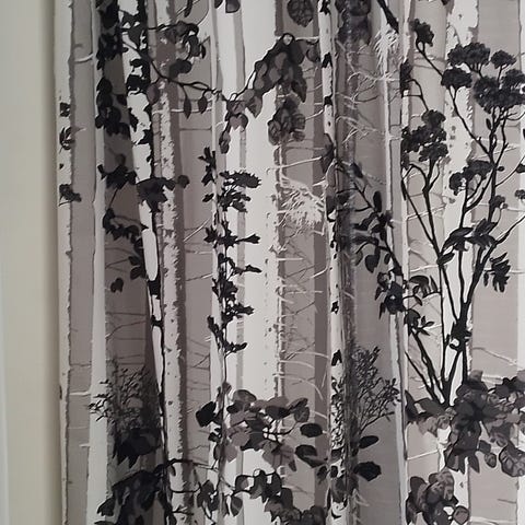 Musta-valko-harmaa tehdasvalmisteinen verho. Alareunaan tehty leveä taite, jonka voi purkaa helposti pois, jolloin jäljelle jää valmisverhon käänne. Lyhennetyn verhon pituus on n 222 cm.