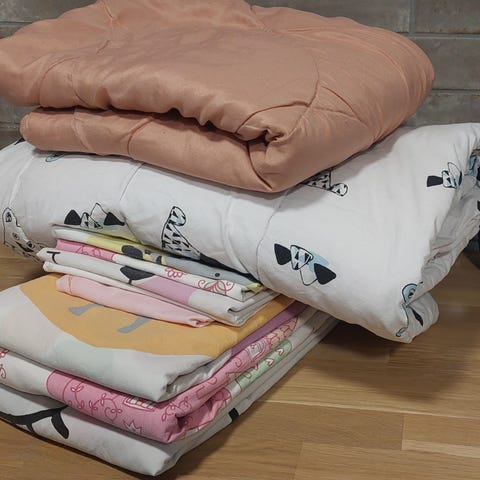 2 kpl peittoja: talvipeitto (Familon https://www.lastenturva.fi/kotiin/familon-original-print-lastenpeitto-115x150cm/p/6438291100248/#description) sekä kesään viileämpi peitto samaa kokoa.