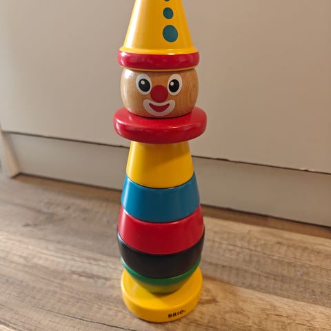 Huom. Tämä lelu ei ole Brion valmistama, en tiedä valmistajaa. Koiran toimintaperiaate on, että pohjassa olevaa nappia painamalla koiran puuosat löystyvät narujen varassa ja se "romahtaa", ja napin vapauttaminen palauttaa sen pystyasentoon. Tällä voi harjoitella sorminäppäryyttä. Lelu on hyvässä kunnossa, ollut koristeena.