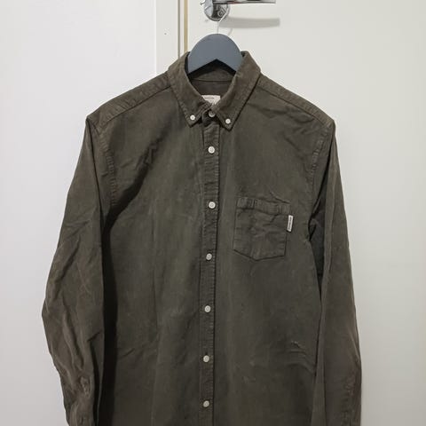 Miesten vihreä puuvillatakki, koko L. Takissa on pitkät hihat, kaulus ja nappikiinnitys edessä. Edessä on kaksi rintataskua läpillä. Materiaalina on puuvilla,