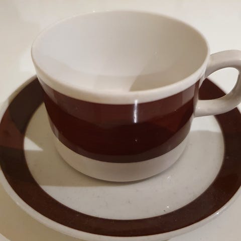 Kupin korkeus 6,3 cm, lautasen halkaisija 13,8 cm.