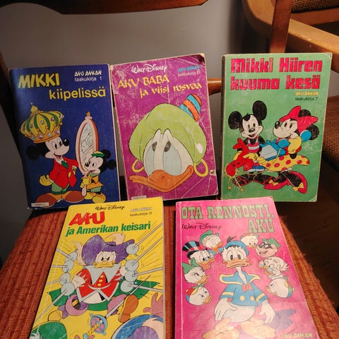 Ylimääräinen tupla Aku Ankan taskukirja. Näköispainos kirjoista 2 Aku Ankka ja Karhukopla sekä 3 Viidakon vaarat. Yksi kansitaittuma, sisäsivut hyvässä kunnossa. Mikki Hiiri, sarjakuva, Nouto tai postitus.