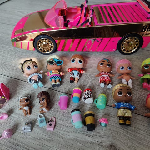 Suomessa harvinainen USA:st tuotu L.O.L. Surprise nukke- ja musiikkisoittimet lelusetti. Se sisältää mm ehjän ja siistin nuken sekä kolme kitaraa, rummut, levysoittimen, pianon, jonka tuolia on fiksattu. Kitarat, rummut ja levysoitin soivat ja paristot tulevat mukana! Ebay:ssa kitarat noin kympin kappale.