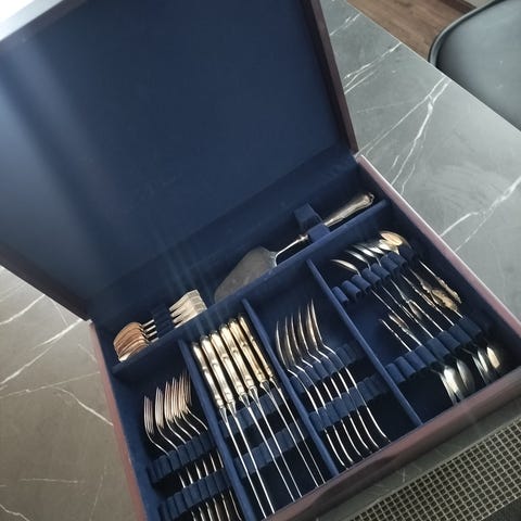Saurum paistiottimet, veitsi + haarukka. Haarukan pituus 28cm, veitsi 34cm. Kahva 830 hopeaa, teräosat terästä. Setti käyttämätön, rasia kulunut.