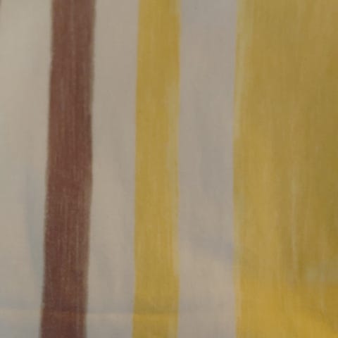 Kasi verhoa: pellavantyyppistä raidallista kangasta, ei täyttä varmuutta, onko. Valo kuultaa läviste. Verhojen alaosassa tummanruskea leveä ommeltu "kantti" . Jos se ei kiinnosta, ja pituus riittää, sen voi toki poistaa. Kantissa on toisella puolella hieman haalistumaa.