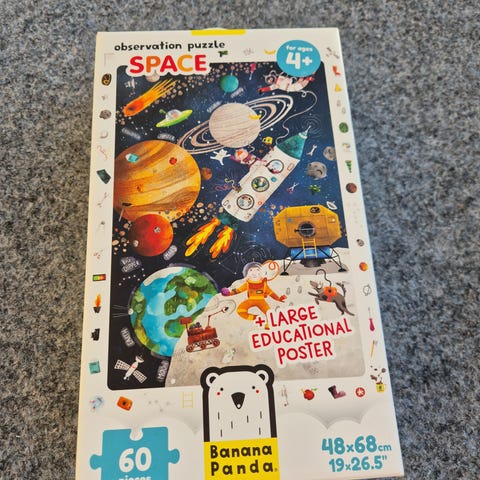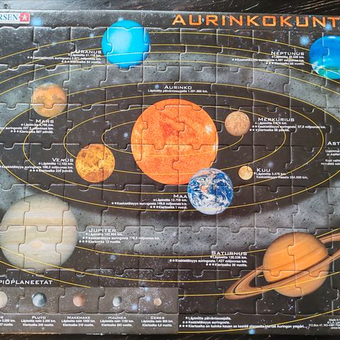 Hyväkuntoinen 150-palan avaruuspalapeli. Koko koottuna 59x40cm. Kaikki palat tallessa, mutta kahdessa palassa hieman kulumaa (kuva 3). Normaalisti sisältäisi myös pienen vihon mutta sitä ei löydy.