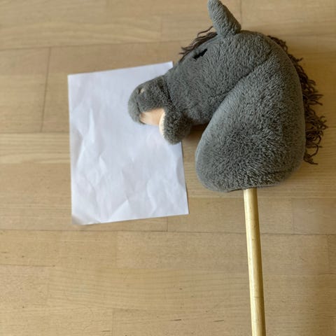 Harmaa keppihevonen, jonka mukana tulee vaaleanpinkit suitset. Suitsetkin on tehty itse. Hepan harja/hiukset ovat hieman takussa, mutta yleiskunto on ihan hyvä.