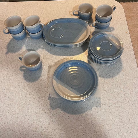 Kultakeramiikan kahviastiasto (uusi), kahvikuppeja ja aluslautaset x6, pienet lautaset x6, tarjoilukannut x2, sokerikko.