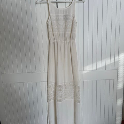 H&M mekko / kesämekko, koko 32 / xxs. Valkoinen, jossa sininen perhoskuviointi. Ohuet säädettävät olkaimet ja edessä nyöritys. Mekon pituus minimittainen. Mekossa on läpikuultava, ohut päällyskangas ja kiinniommeltu joustava, valkoinen alusmekko. Pari haaleaa tahrajälkeä edessä peruspesun jälkeen. Ei kokeiltu tahranpoistoa, Hyväkuntoinen mekko kesään.