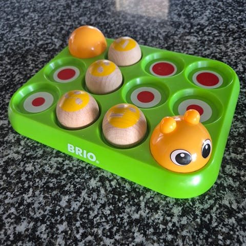 BRIO lasten leikkipeli, jossa vihreä pelialusta ja puisia sekä muovisia peliosia. Pelissä on yhdeksän paikkaa nappuloille ja erivärisiä, pyöreitä osia, joita voidaan painella tai siirrellä. Soveltuu pienten lasten motoristen taitojen ja hahmottamisen harjoitteluun.