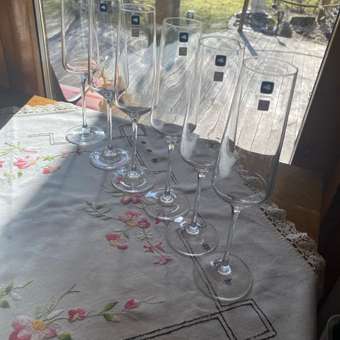 Samppanjalasi, jossa kirkas lasiosa ja vihreä lasinen jalka ja jalusta. Materiaali on lasia. Sopii esimerkiksi kuohuviinin tai samppanjan tarjoiluun. Yksittäinen lasi, mitat ja mallin tarkka nimi eivät ole tiedossa kuvien perusteella.