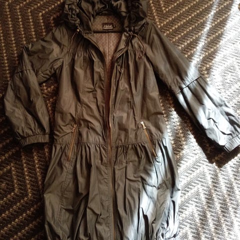 Naisten puolipitkä takki vyöllä. Seppälästä ostettu eli melkein vintagea, jäänyt kaapin perukoille, vähän käytetty. Vastaa hyvin merkittyä kokoa. Kangas puuvilla/polyesteri. Himmeä kiilto, väri vaalea beige.