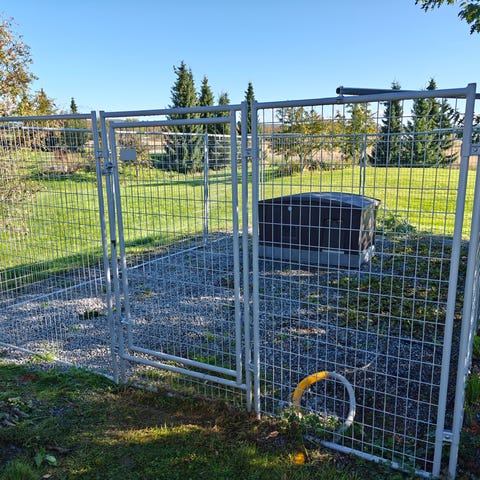 3 koiratarhaa purjettuna kunto ok, käytön tuomaa kulumaa, verkko alhaalta tiheämpi silmänen. tarhan ovet säästetty, kestänee vielä käytössä. laitoin pari kuvaa kokonaisista tarhoista havainnollistamaan ollutta kokonaisuutta. Mikäli hinta ei miellytä saa tarjota.
