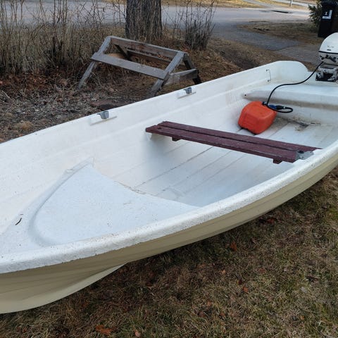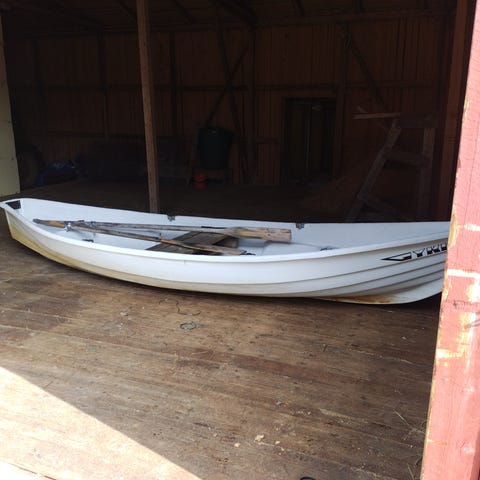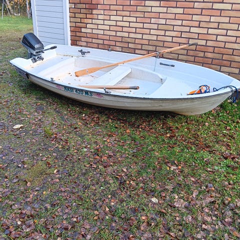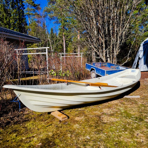 Lähes uutta vastaava soutuvene, pieni nirhama laidassa. Muuten hyvä. Omatekoiset airot ja kuvissa likainen.