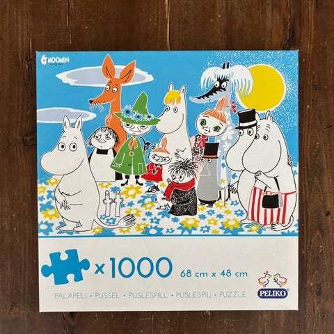 Peliko Muumi -palapeli, jossa on 1000 palaa. Valmiin palapelin koko on 68 x 48 cm. Sisältää palapelimaatto.
